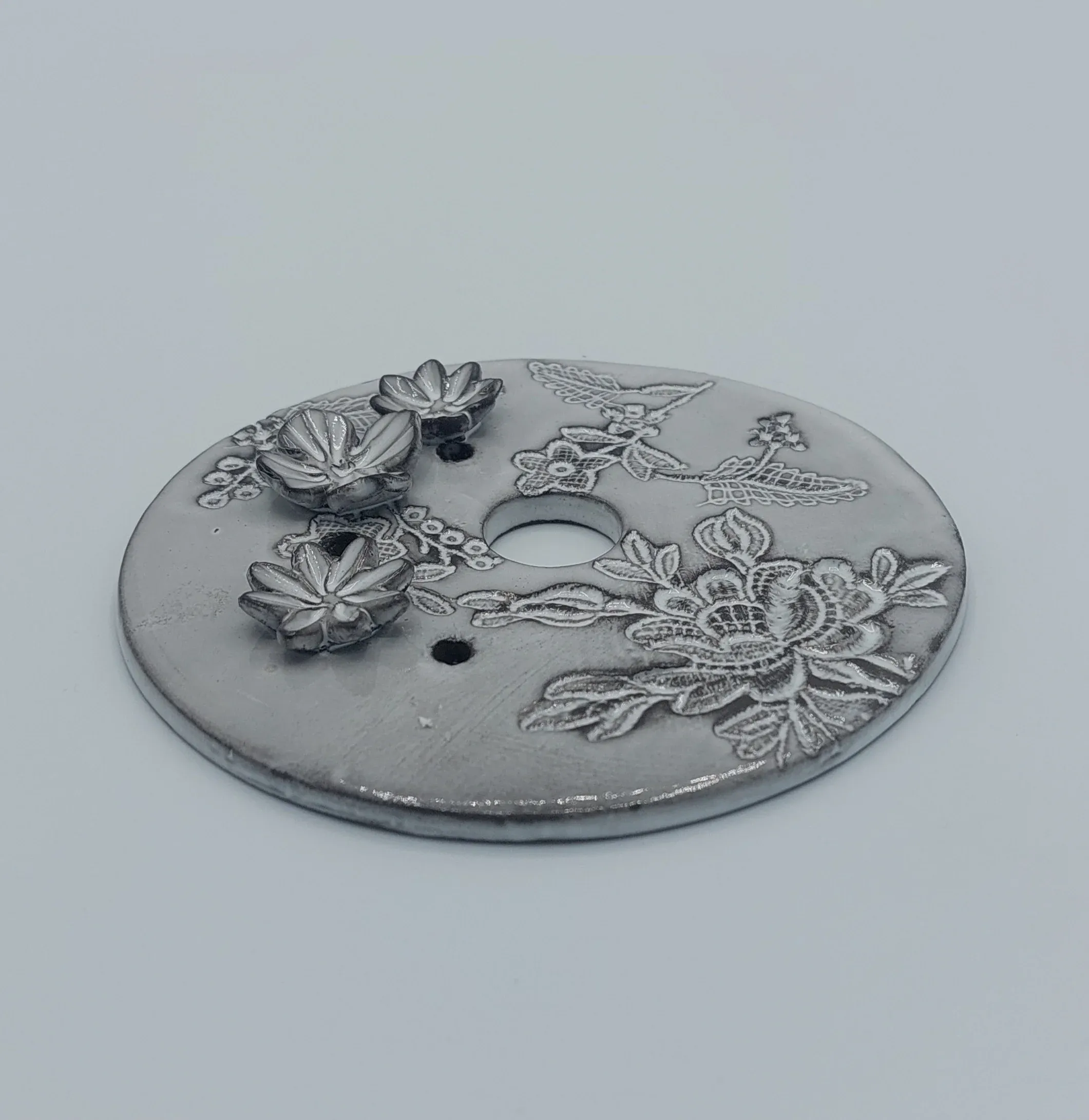 Chaque pique-fleurs est fait-main et unique. Son façonnage délicat est orné d’une fine empreinte de dentelle laissant apparaître le travail des fuseaux des dentelières.
